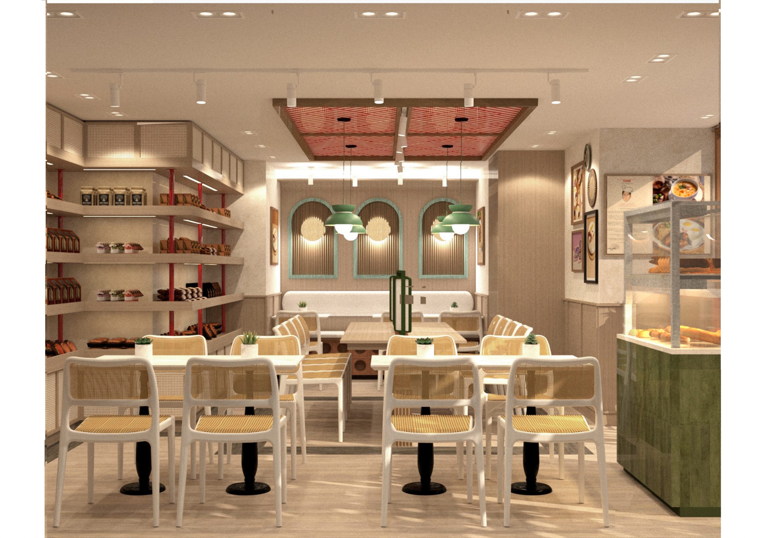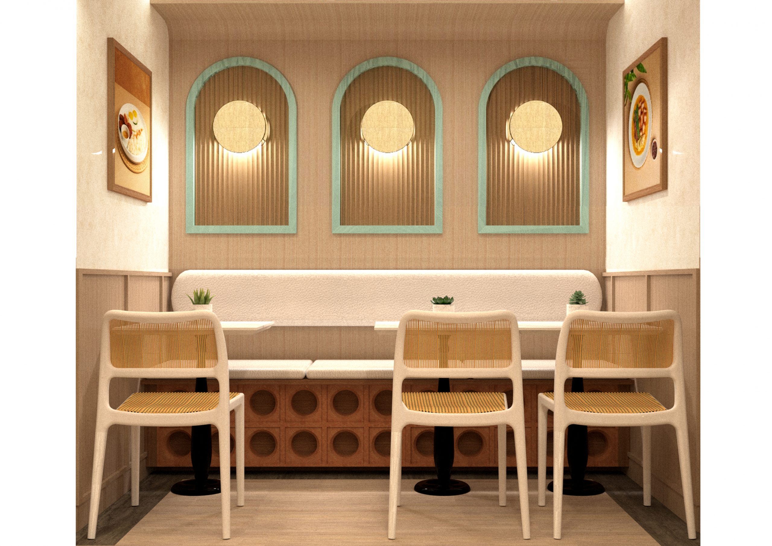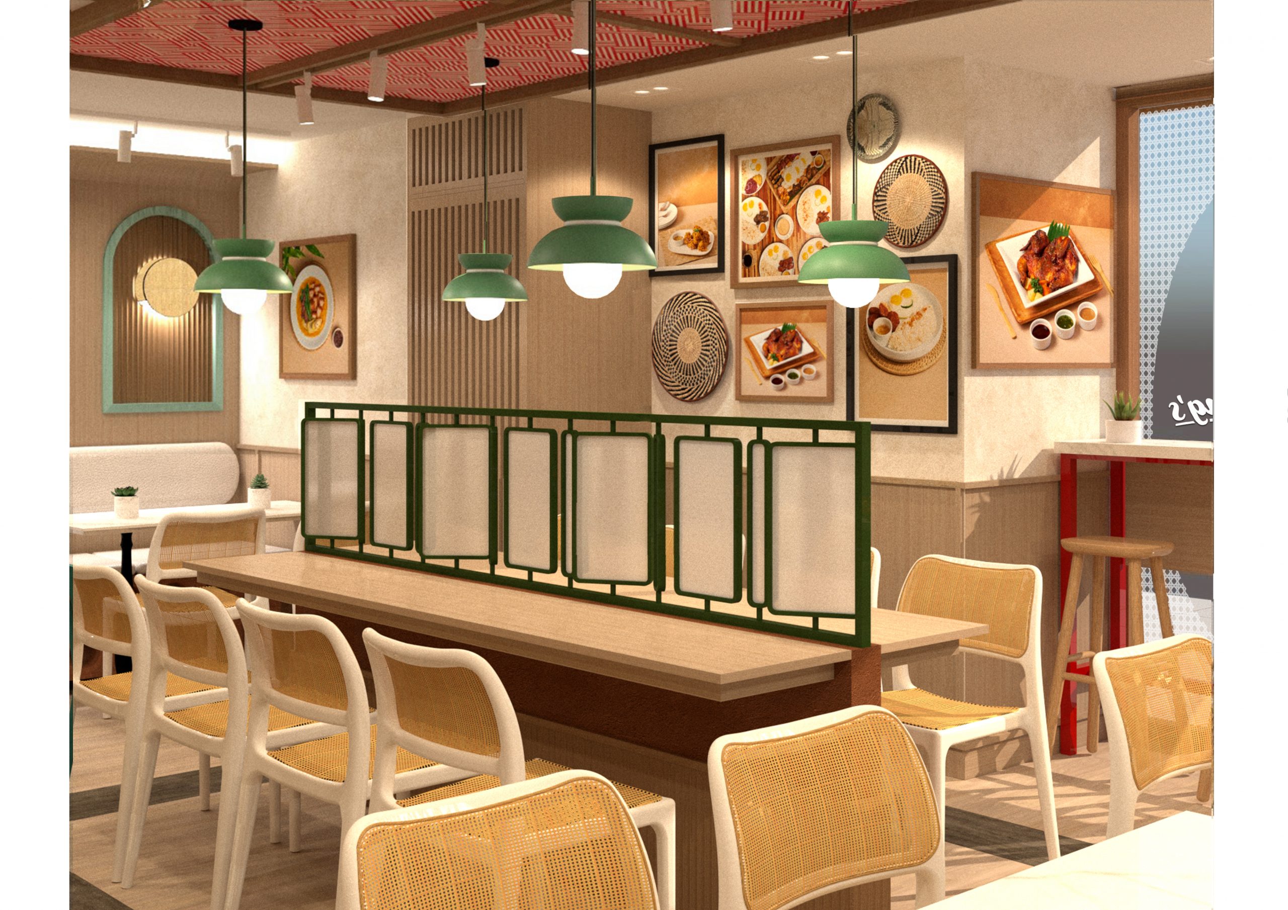 This restaurant was created with a homelike feel in mind. Playful hues paired with distinctly local details and a touch of contemporary elements form the character of the space. The brand’s theme of Filipino Spirit is further accentuated in the use of rattan, bamboo, as well as the unmistakable Solihiya pattern. The color palette is a reflection of the brand's identity--bold, fresh, and wholesome. In addition to this, wood is used as a major material to lend warmth to the space. The application of texture in the stucco walls, embossed tiles, and the terracotta clay breeze blocks ties everything together.