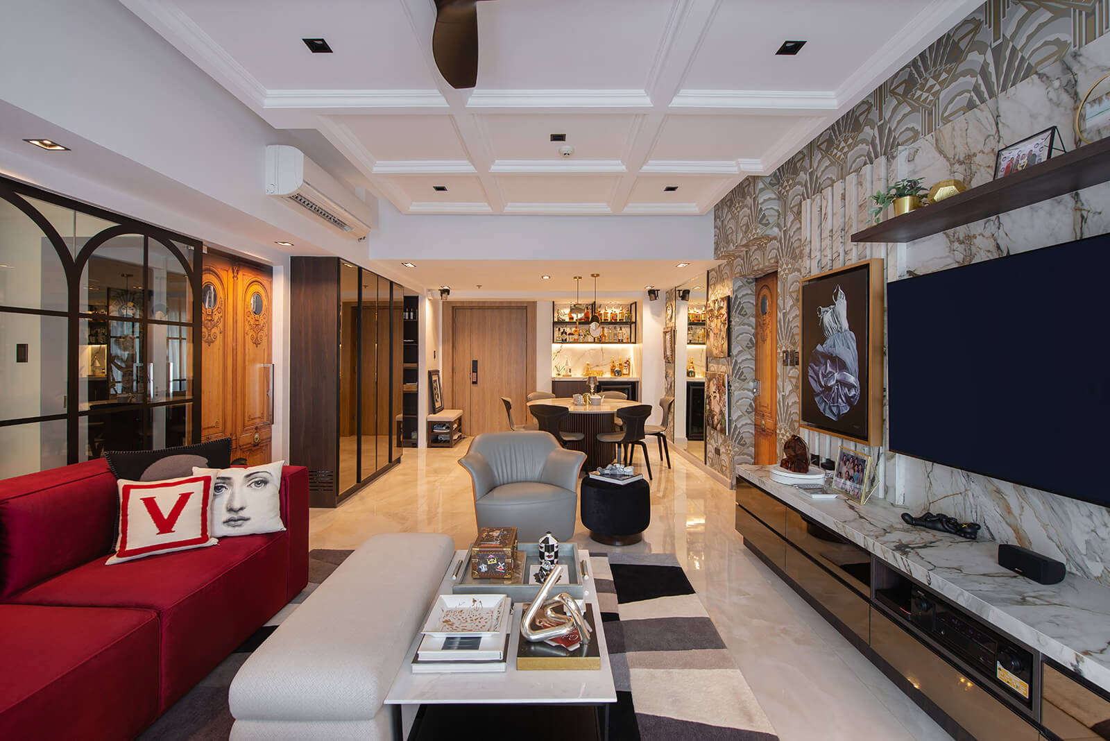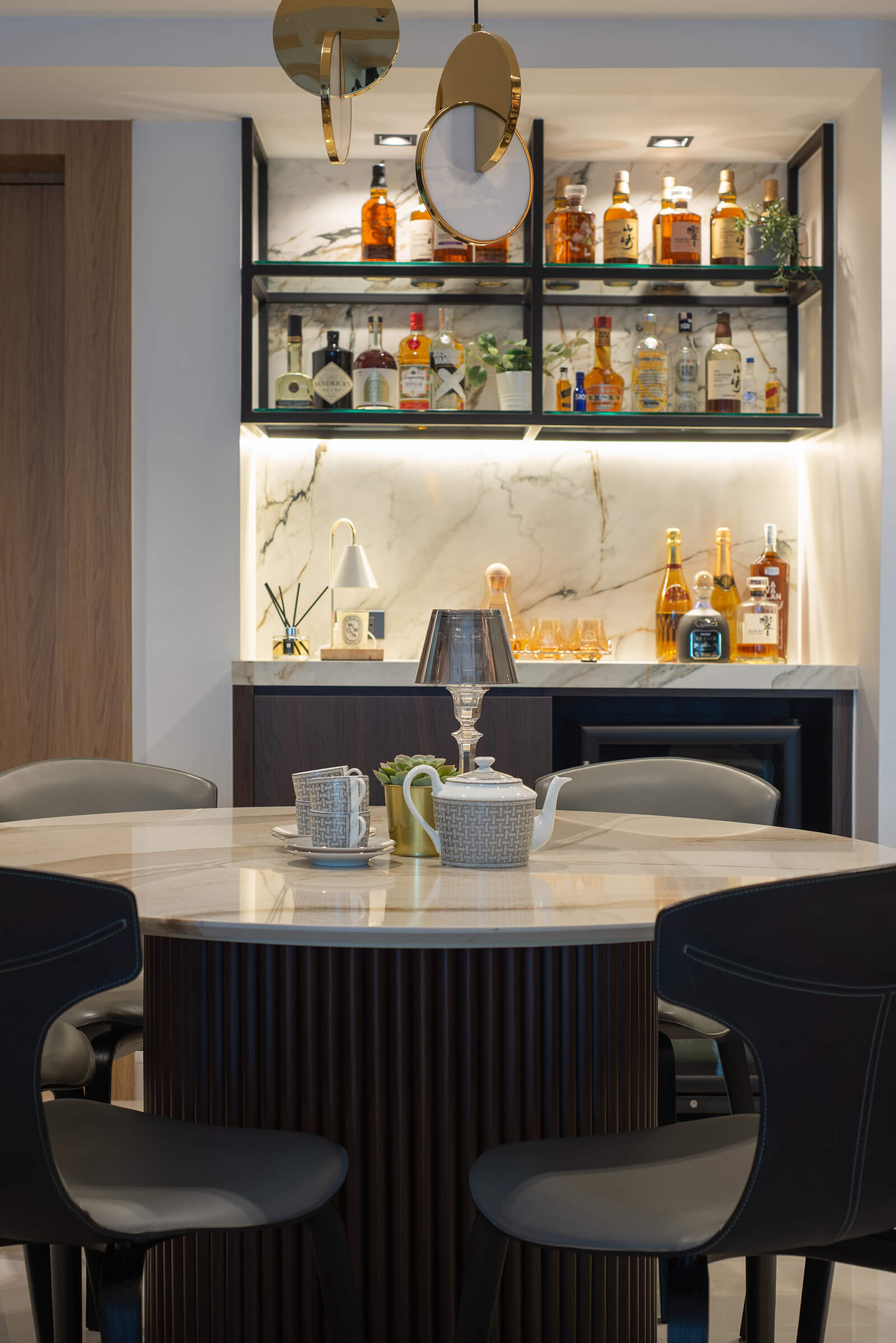 This modern and artistic interior design of this residential space embodies innovation, creativity, and audacity, resulting in an enchanting ambiance. Geometric shapes, sleek lines, and an amalgamation of materials converge to achieve a contemporary aesthetic. The open floor plan, abundant natural light, and the client’s artistic collection define the interior. Abstract paintings, artistic figurines, patterned wallpapers, and vibrant yet neutral furniture hues coalesce to create a visually stunning and inspiring atmosphere.